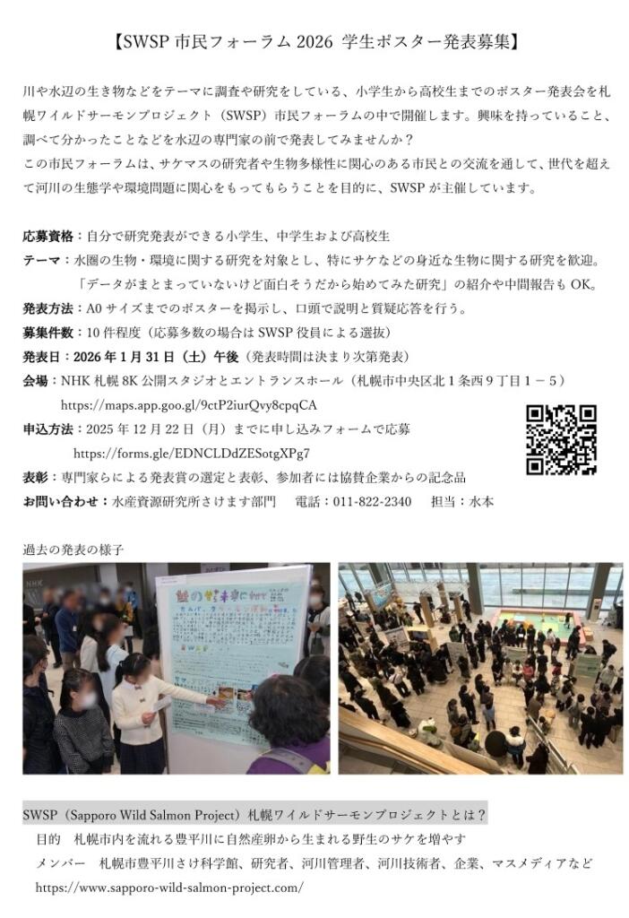 川や水辺の生き物などをテーマに調査や研究をしている、小学生から高校生までのポスター発表会を札幌ワイルドサーモンプロジェクト(SWSP)市民フォーラムの中で開催します。興味を持っていること、調べて分かったことなどを水辺の専門家の前で発表してみませんか?