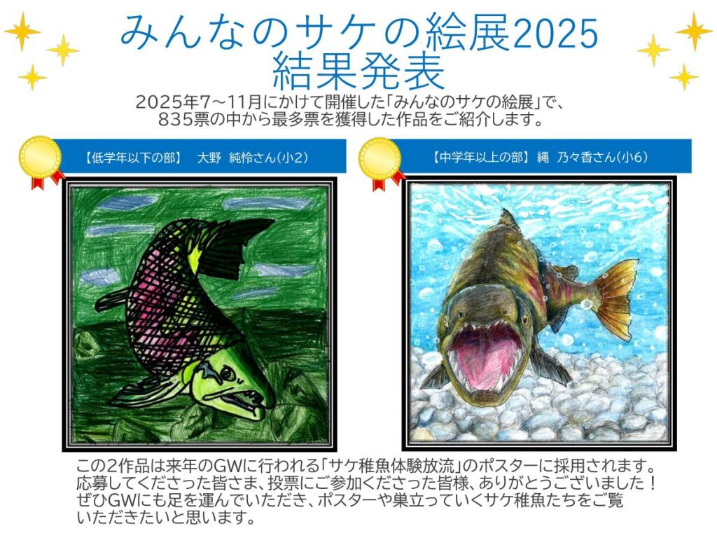 この作品は、2026年春のサケ稚魚体験放流のポスターに採用されます。