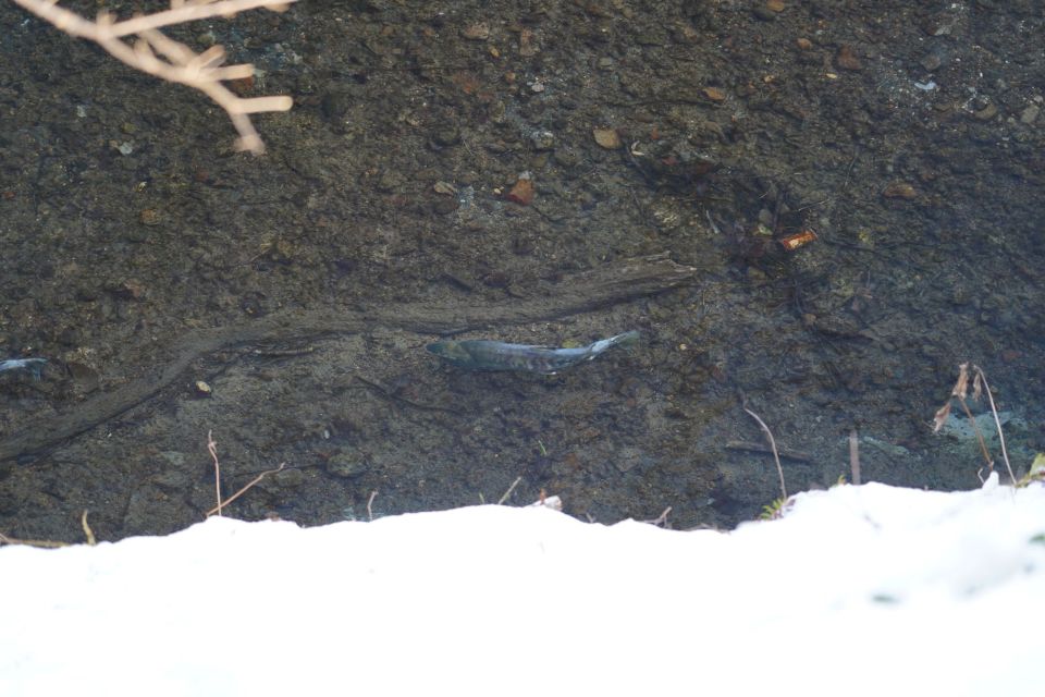 サケ 12月23日 千歳川 ウサクマイ さけます情報館の300mほど上流右岸の分流。【場所】まだ遡上したての綺麗な個体が20本ほど泳いでました。河川水温6℃、支流湧水は8℃